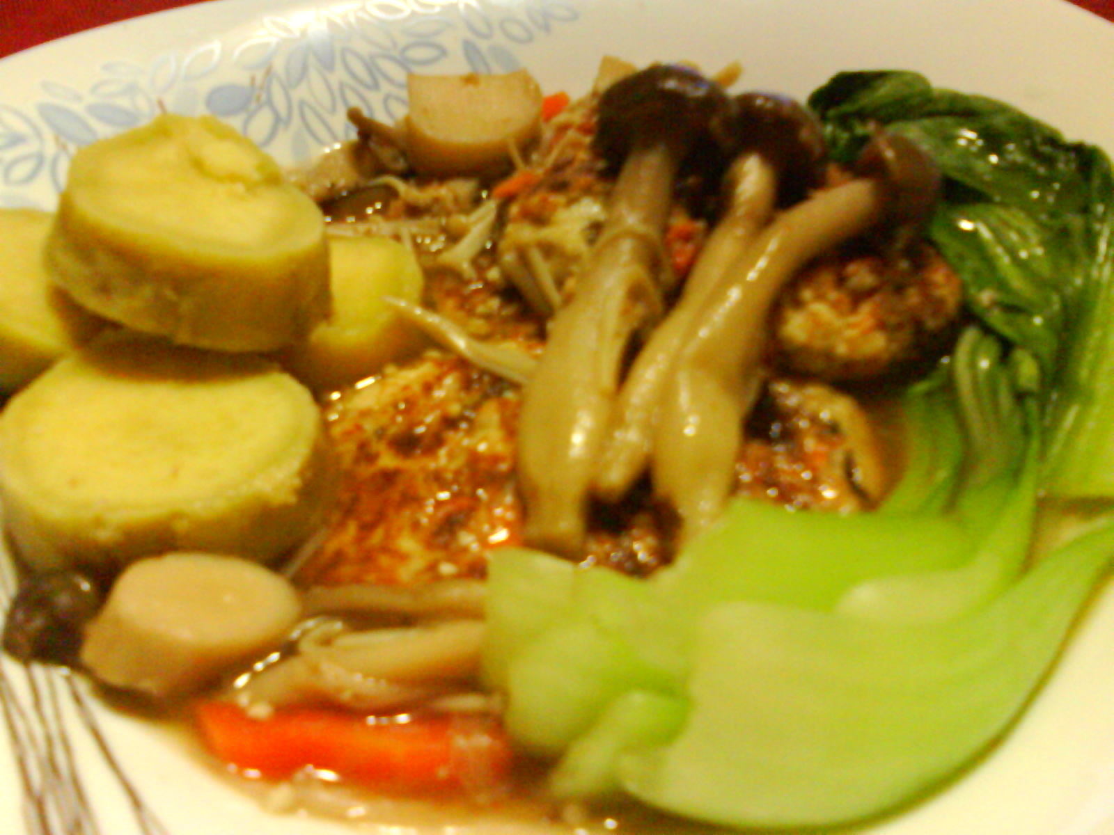 1. 蒸地瓜一條 2. 紅蘿蔔絲些許 3.蕈菇 (金針菇、杏包菇、柳松菇及袖珍菇) 些許 4. 青江菜一株 5. 油、醬油、小米酒酌量 6. 薑絲些許 (可有可無)